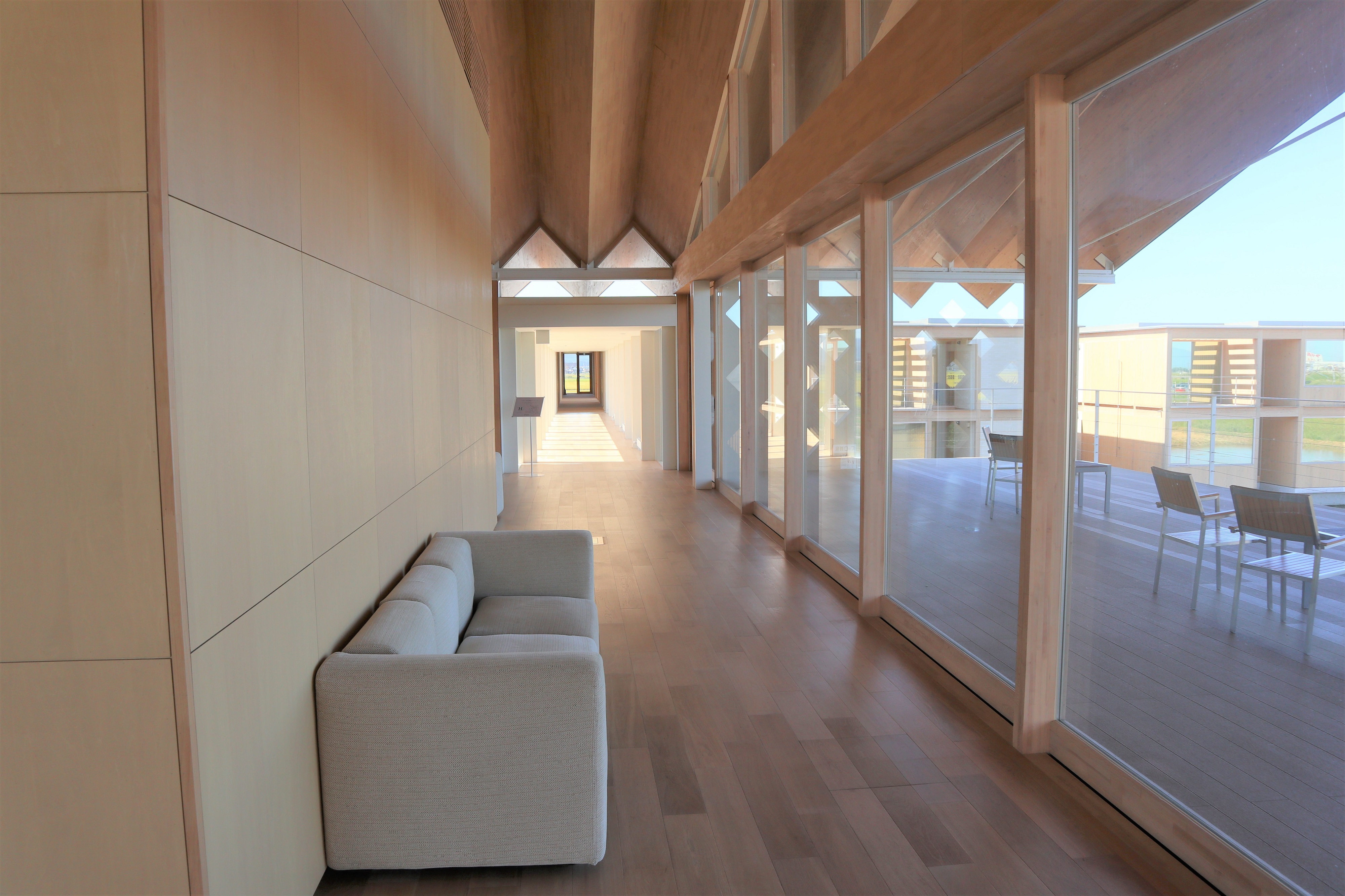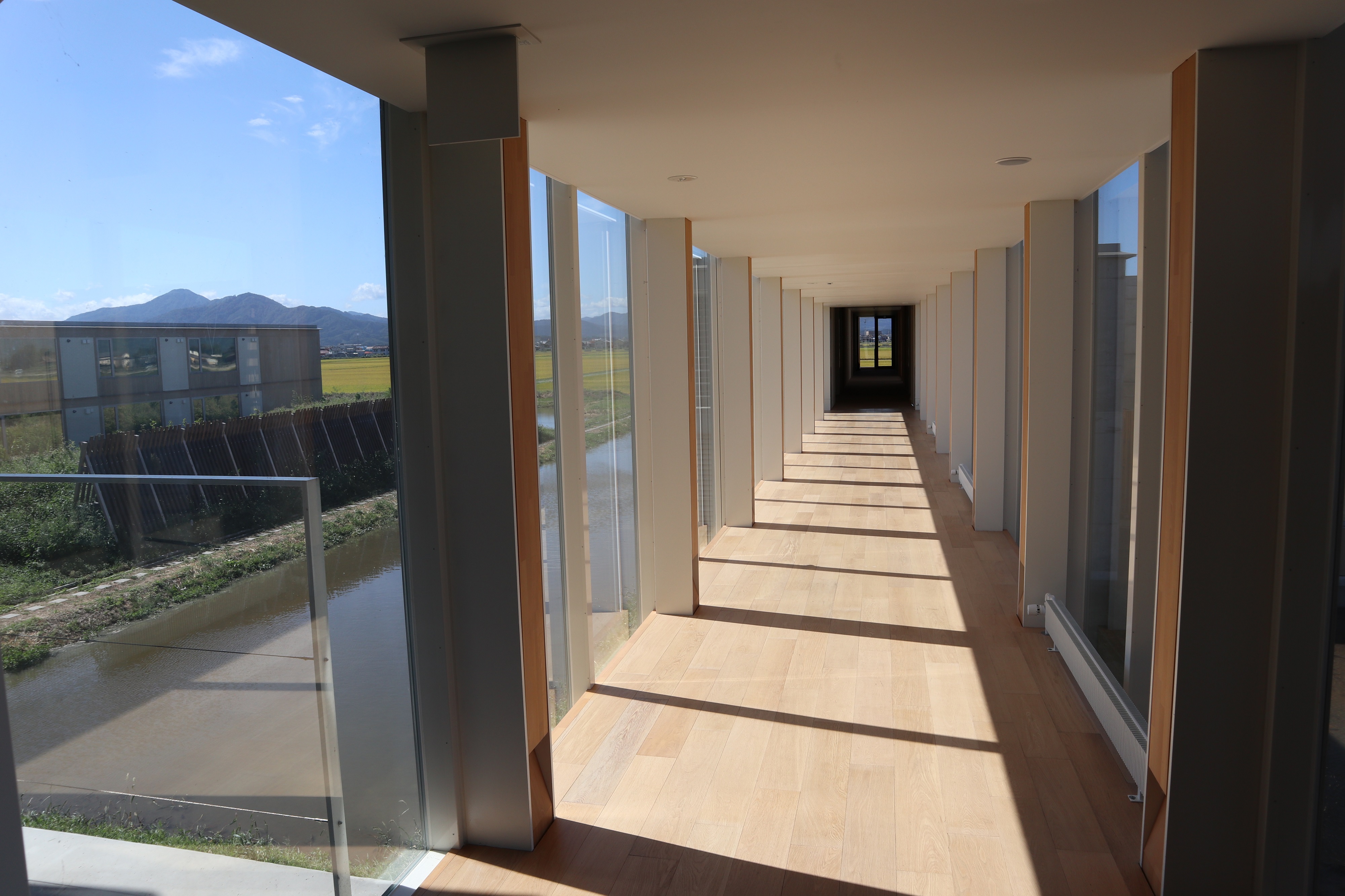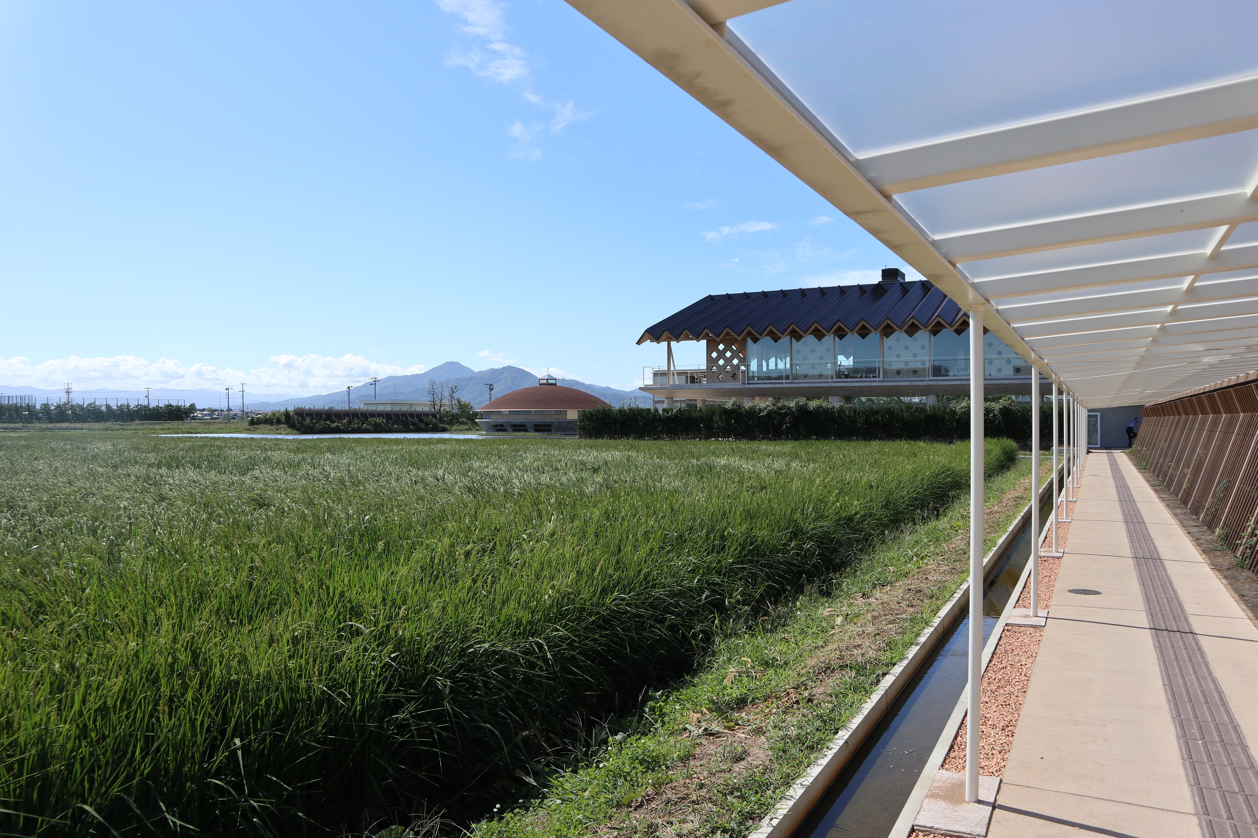 館内にいてもまるで水田の中にいるように感じる大きな窓がいっぱい。