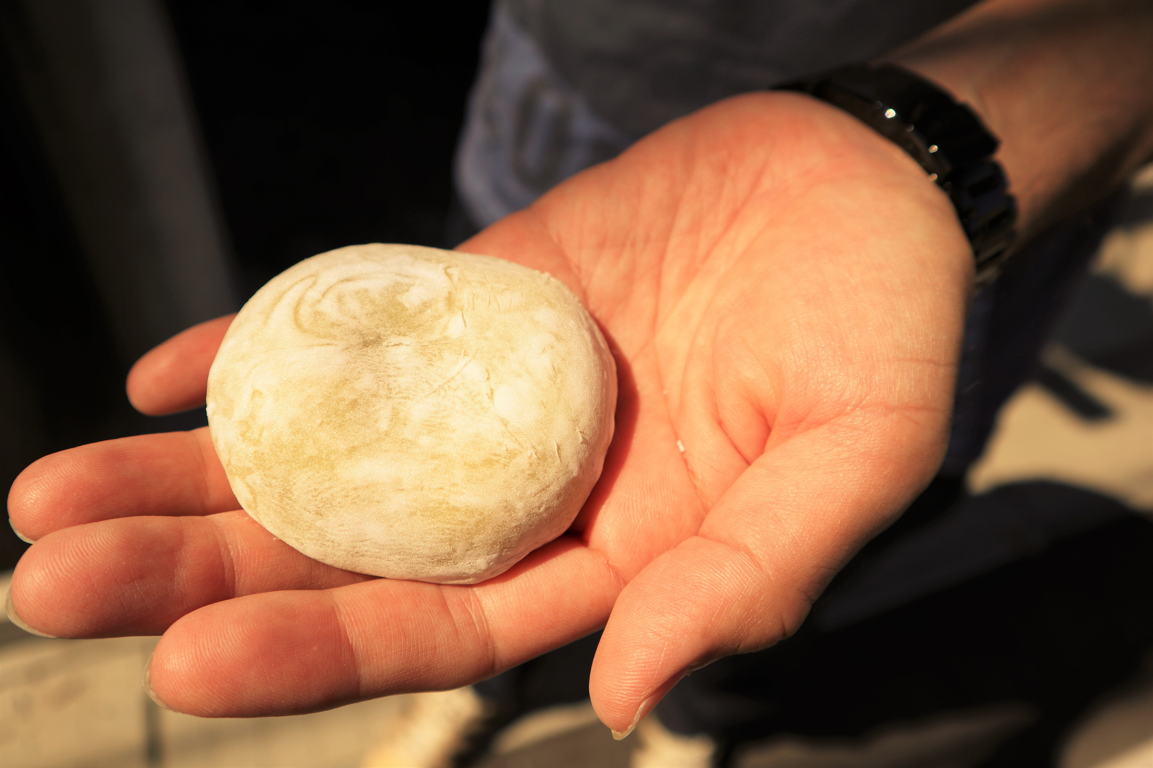 ほんのり黄色く、耳たぶのように柔らかく、中には甘さ控えめのこし餡が入っていて、栃の実が香る美味しいお餅。
